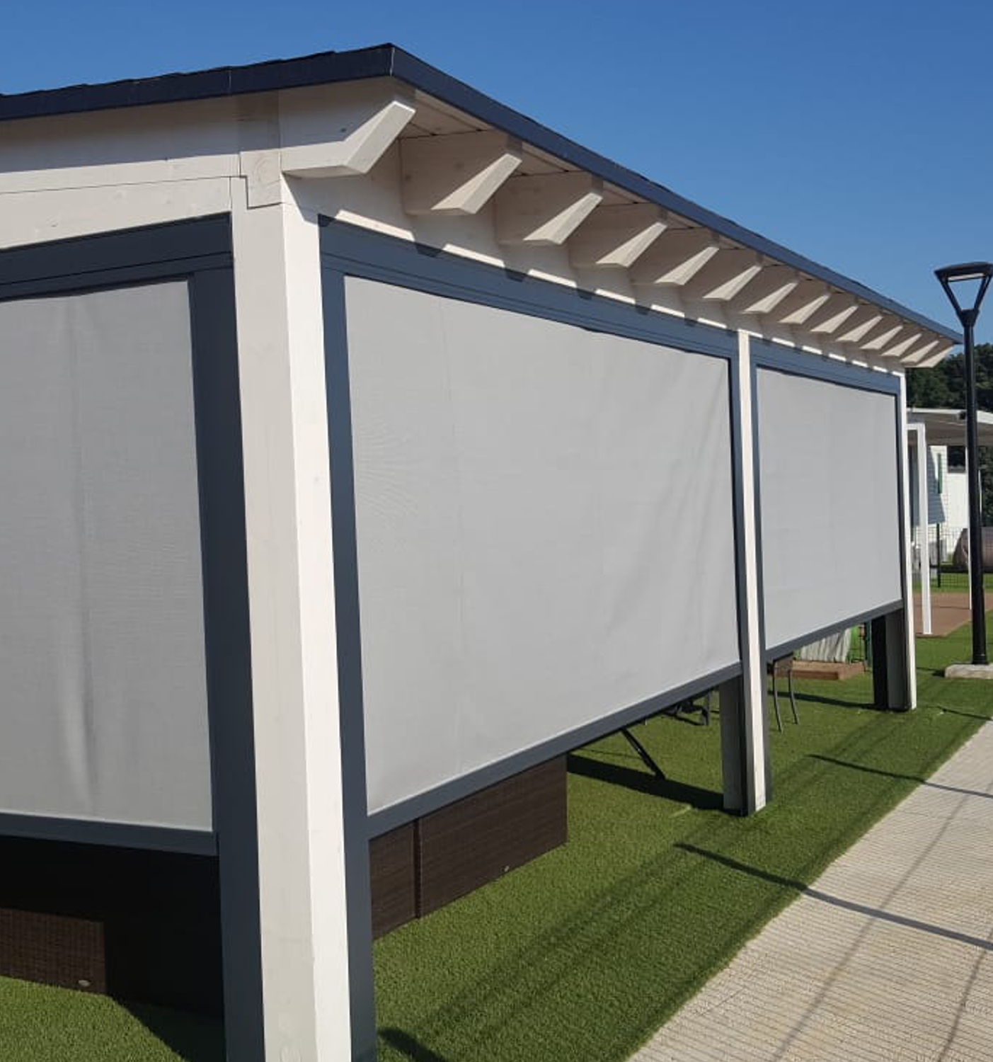 Se aplica en toldos planos o de palilleria además de ponerse en espacios abiertos para un aire mas acogedor ya que protegen de viento y lluvia se pueden confeccionar con una ventana transparente o ventana inglesa.